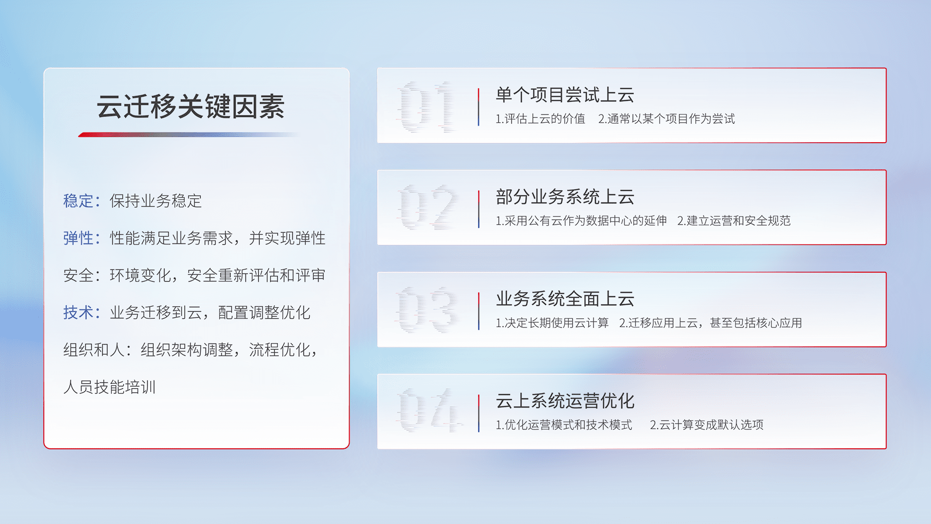 结合实际业务,,从规划设计、、云平台选型、、云原生改造、、、数据迁移、、集成交付,,迁移全过程为客户识别最佳上云路径,,做好风险识别管理,,,设计网络架构、、身份权限、、、安全审计合规、、操作审计、、、日志审计、、监控告警策略、、、、多站点容灾设计等,,,对云上基础设施进行整体规划,,提升IT治理水平,,,以满足弹性、、高可用、、高性能的需求。。。