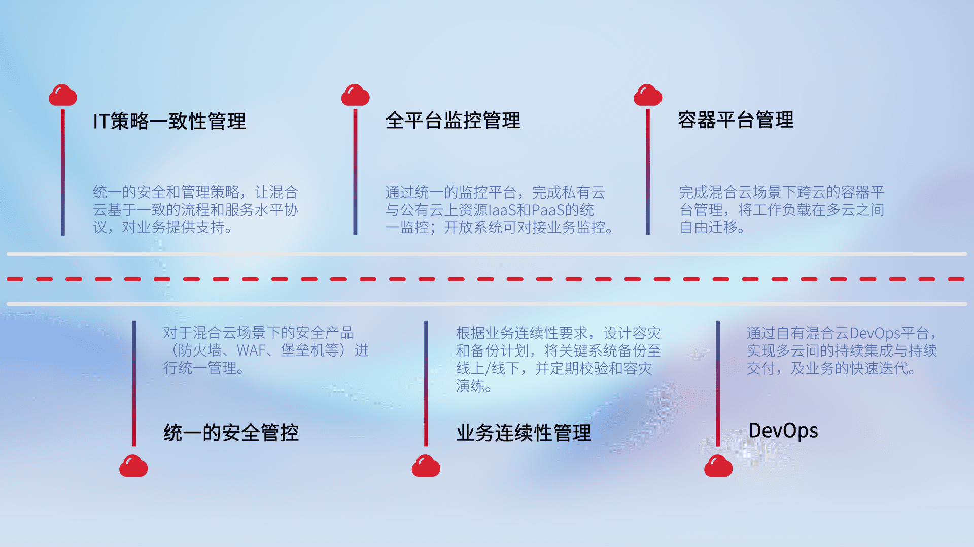通过多云纳管,,,以统一的资源数据模型把客户的云资源进行抽象和封装,,进而实现对多云资源的统一操作,,,保障云资源管理的可靠性、、、稳定性与可用性。。。。量身定制化运维内容,,,,配置、、开发运维、、、补丁管理、、备份、、、、监控、、、、认证和访问管理、、、、审计和日常巡检等,,,,保障在用云过程中的可靠度,,,稳定度以及高可用率。。。
