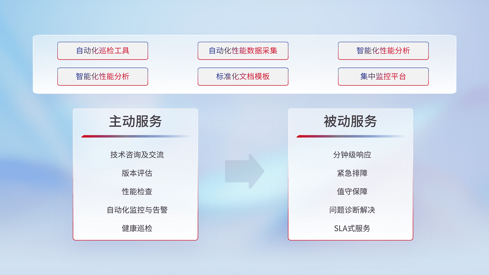 智能化工具和标准化文档,,,,保障服务质量,,提供主动服务(包含技术咨询、、、版本评估、、性能检查、、、自动化监控与告警、、、健康巡检)和被动服务包含(分钟级响应、、、紧急排障、、、值守保障、、问题诊断解决、、、、SLA服务)。。。